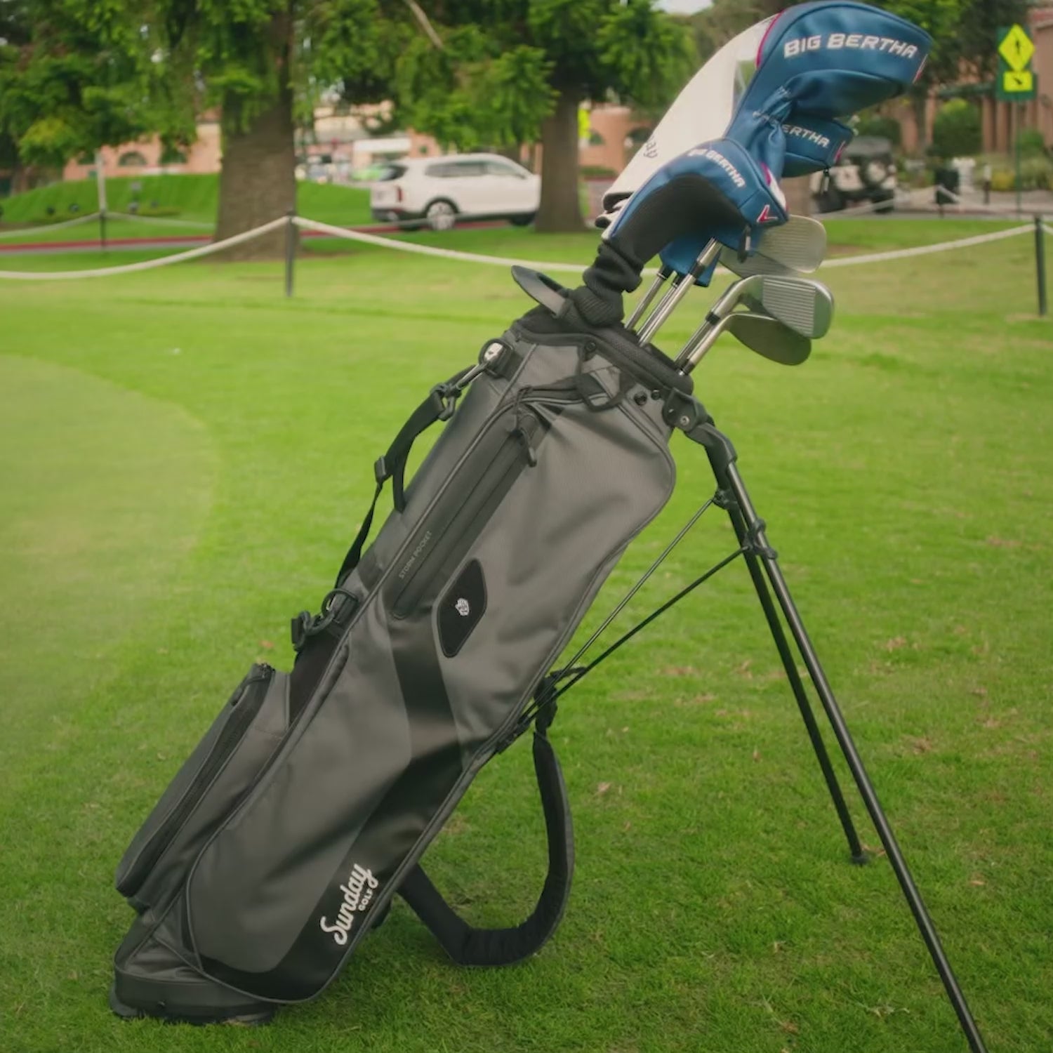 Great looking bag with tons of great features. Super light for walking and fits comfortably on a cart. I think the tee pockets on the outside of the bag is my favorite part.